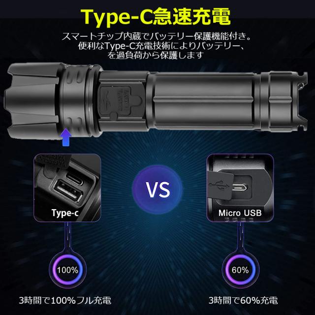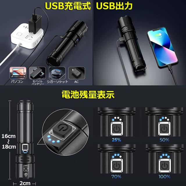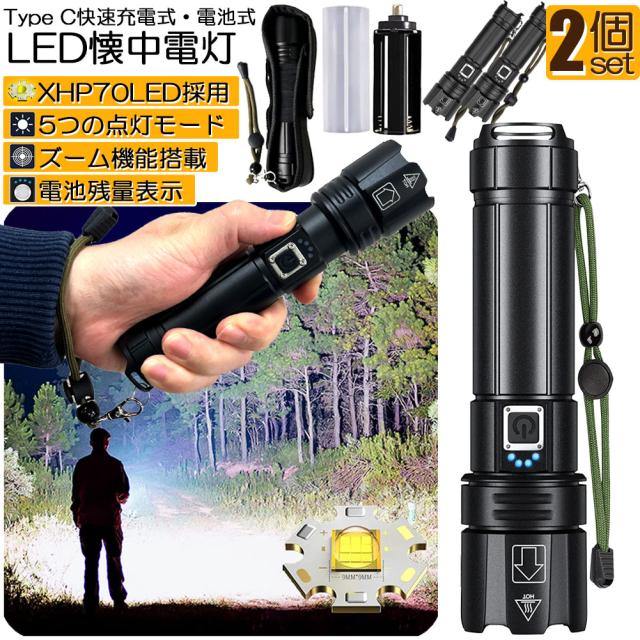 懐中電灯 XHP70 強力 防水 2個セット USB充電式 電池式 LCD残量表示 ズーム機能 5モード調光 TYPE-C入力 USB出力 ledライト フラッシュライト かいちゅうでんとう led 明るい ハンディライト 登山用品 防災 停電対策 夜釣り