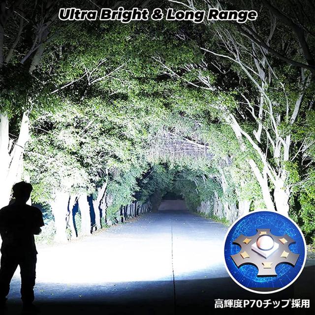 【超高輝度LED懐中電灯/ストラップ付き】LED懐中電灯は新世代のXHP70.2ランプビーズを採用し、普通のT6 ledチップより約5倍進化し、照射距離最大約500メートル、点光源テスト1500ルーメン、射線光源10000ルーメン+ /平方フィートです。停電時に天井に光を当てると、部屋全体を簡単に照らすことができ、明るくて遠くまで照射可能です。大人の手のひら程度のコンパクトなデザインは片手で簡単に操作できます。ストラップが付いており、使用時に落下する心配はありません、持ち運びに非常に便利です。【ズーム機能搭載/5つの照明モード】ズーム機能を搭載しており、ヘッド部分を伸縮させるだけで、広範囲照射モードと遠距離照射モードの切り替えが可能です。遠距離照射モードは最大照射距離が500m、180度広範囲照射モードは暗室全体を簡単に照射できます。5つの点灯モードを搭載し、照明ボタンを押すだけで簡単に高輝度→中輝度→低輝度→点滅→SOS→OFFを切り替えできます。更に、どのモードでも、スイッチを2秒間長押しすると消灯できます。操作が簡単で便利です。