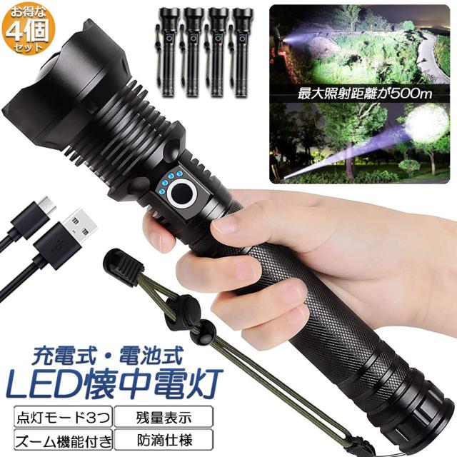 懐中電灯 ledライト XHP70 ハンディライト 4個セット 強力 防水 USB充電式 電池式 LCD残量表示 ズーム機能 3モード調光 Type-C充電式 ledライト フラッシュライト led 明るい ハンディライト 登山用品 防災 停電対策 夜釣り