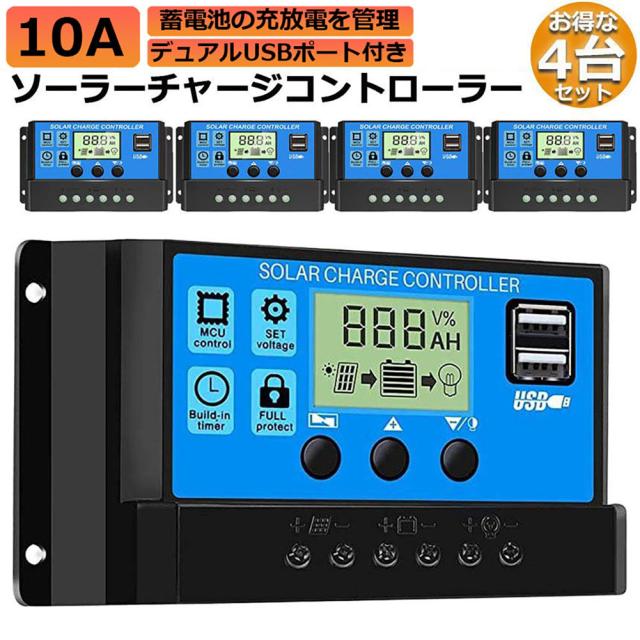 ソーラーチャージ コントローラー 4個セット 10A 12V 24V 鉛蓄電池車バッテリー充電コントローラー USBポート 付き LCD液晶表示 ソーラーパネル 太陽光パネル 接続用 過充電 過負荷 防止保護