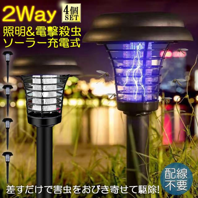 電撃殺虫器 ガーデンライト ソーラーライト 4点セット 電撃 殺虫ライト 埋め込み 自動点灯捕虫器 照明ランプ 強力蚊除け 害虫退治 高圧電撃 太陽光で充電 電気代なし 安全 エコ 整理便利 操作簡単 静音 屋外照明 庭 庭園灯 ガーデン