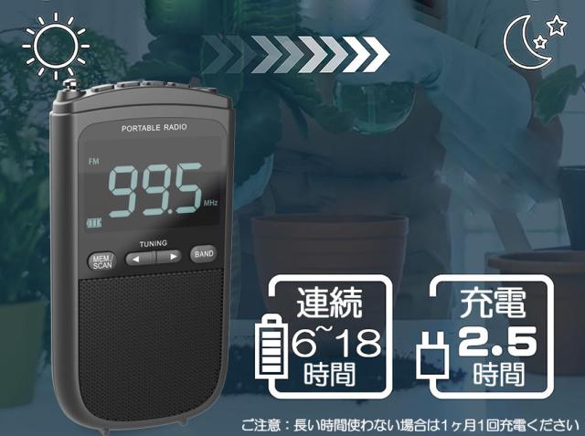 FM受信: 約10時間 (VOL:中)/約6時間 (VOL: 大)