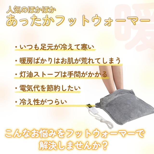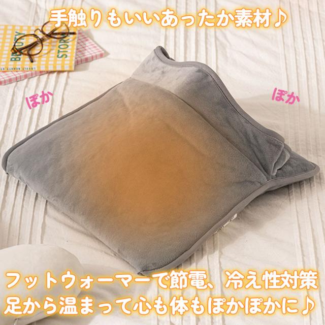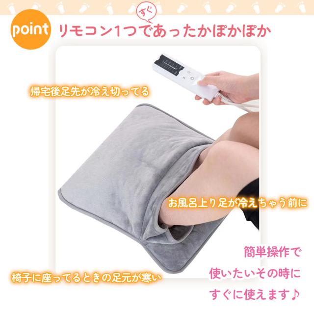ふわふわ手触りのいい素材で、さわり心地が気持ちいいフットウォーマー。コンセント式の電気足温器で、USBタイプに比べて早く暖かくなります。約40度から60度まで加熱できるので、冷えてしまった足も、足元から身体まで暖かくポカポカに。6種類の温度モードがあるので、過熱や過寒を防止することができます。