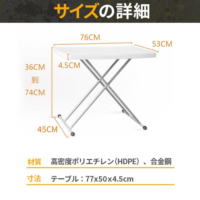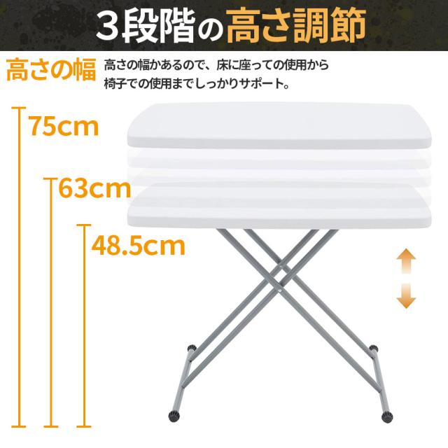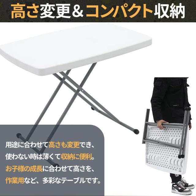 【高さ3段階調節の万能テーブル】普段はしまっておいて、作業時など必要な時に取り出して使用したり、お子様の成長に合わせて高さを変えたり、頑丈で取り回しのいいテーブルです。【安定した設計】脚部分に4つのゴム足が付いており、すべり止めとしてしっかりと安定します。合金鋼の脚は、耐久性にも優れており重いものでも安定して支えてくれます。