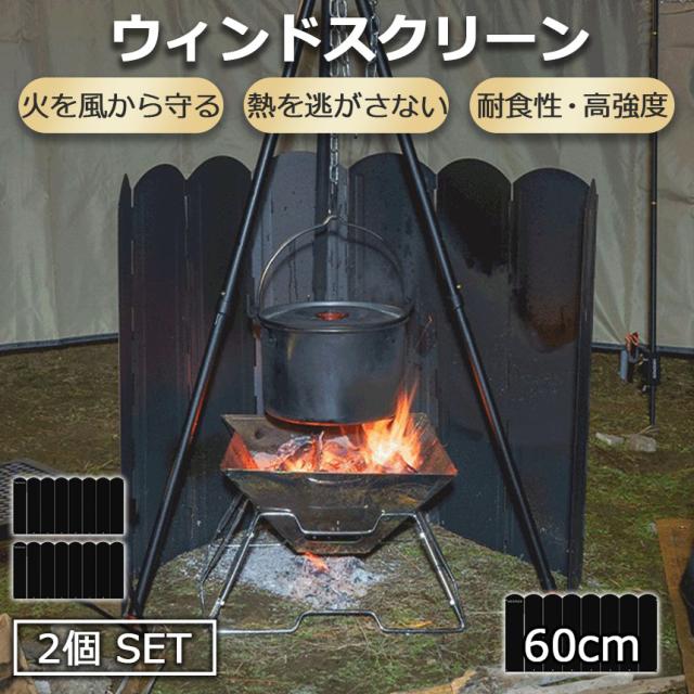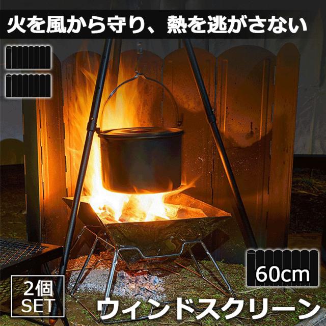 ウィンドスクリーン 大型防風板 60cm 2枚セット ブラック 黒 キャンプ バーベキュー 焚き火 反射板 リフレクター 風除板 防風板 ステンレス鋼 風よけ アウトドア キャンプ用品 収納ケース付き リング付き ストーブ 暖房 焚火 ウインドスクリーン