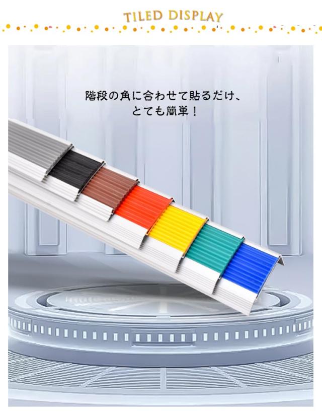 | 防水仕様だから屋外での使用も安心です。 階段の角に合わせて貼るだけ、とても簡単! 表面には溝をデザインしていますので滑りにくくなっています。 強力粘着タイプでしっかり固定できます。 ハサミで簡単にカットできるので階段の長さにあわせて自由にカスタマイズできます。 | |