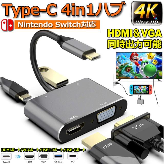 USB C ハブ usb type c ハブ 4K解像度 usb type c HDMI VGA 4in1 アダプタusb c vga 変換 usb c hdmi type c 変換アダプター PD急速充電 USB 3.0 MacBookPro/MacBookAir/ChromeBook/Surface Go/Samsung/Huawei/Nintendo Switchに対応