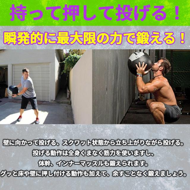 スクワット、プッシュアップ、シットアップなどの筋力トレーニングに負荷をかけるために利用したり、投げる、持つ、掴むなどのボールを使うような動作で全身のトレーニングが可能です。複数人でのトレーニングにもおすすめです。