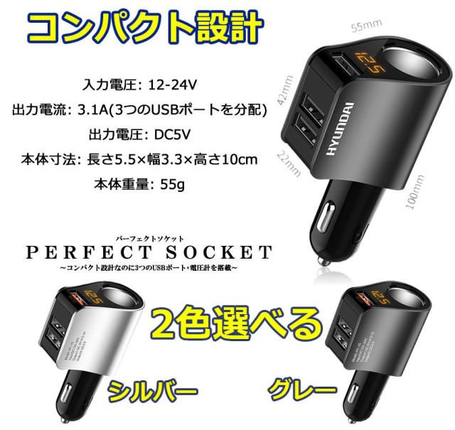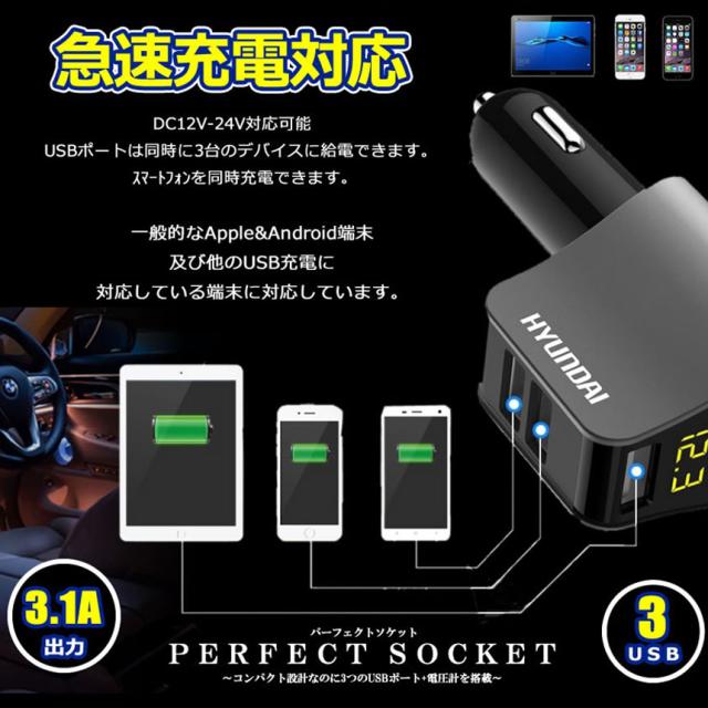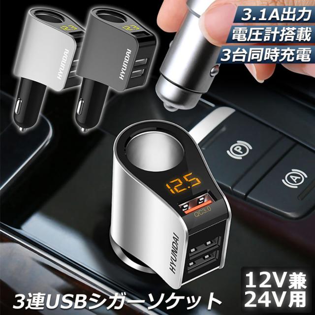 カーチャージャー シガーソケット 3ポート 急速充電 usb 3口 3.1A急速充電 12V 24V 電圧計 iPhone Android iPad Galaxy用 カー用品 シガー増設