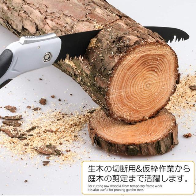 【三面歯設計】効果よく切断できると共に手に快適に設計されています。三面歯設計で太い枝を簡単に切ることができます!生木の切断用&仮枠作業から庭木の剪定まで活躍します。【2サイズ選べる】2サイズご用意いたしました。Mサイズ:長さ540mm(折りたたみ後300mm)/Sサイズ:長さ395mm(折りたたみ後220mm)