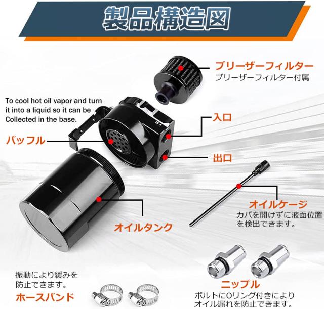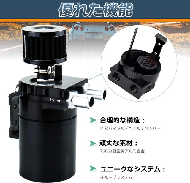 【オイルの劣化を防止】オイルキャッチタンクはインテーク内に戻す前にガスを溜める場所を設け、液化した不純物をできる限り取り除いてしまう。【コンパクト】取付自由度の高いコンパクな設計です。材質は軽量で耐久性に優れたアルミを採用しています。