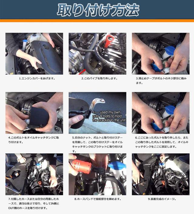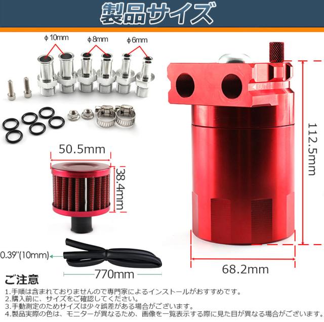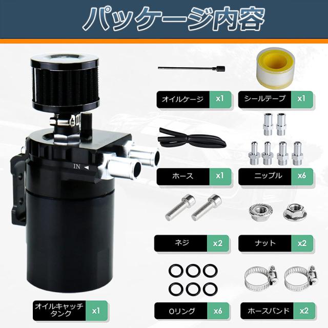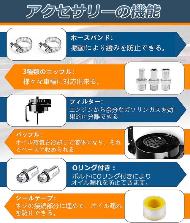 【パッケージ内容】 オイルキャッチタンク*1、 φ10mmニップル*2、 φ13mm ニップル*2、φ16mm ニップル*2 、ホース*1、 ホースバンド*2、 Оリング*6、スチールウール*1、シールテープ*1