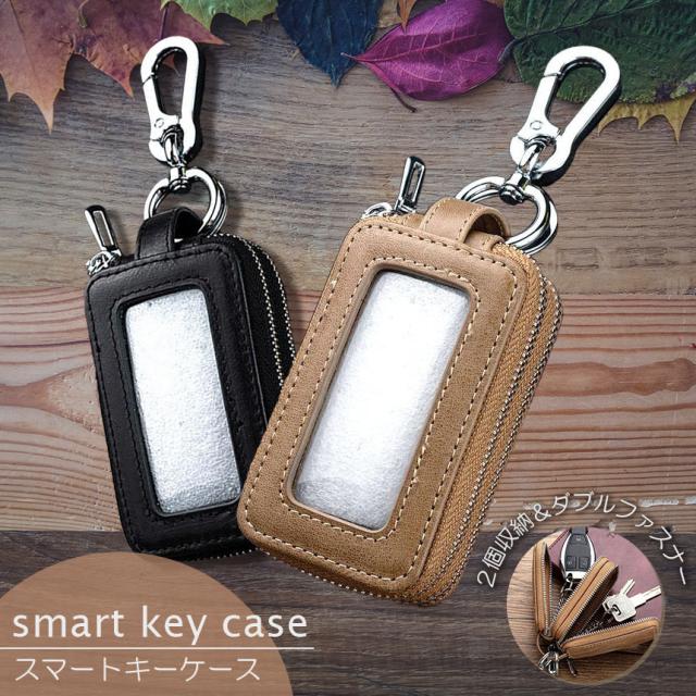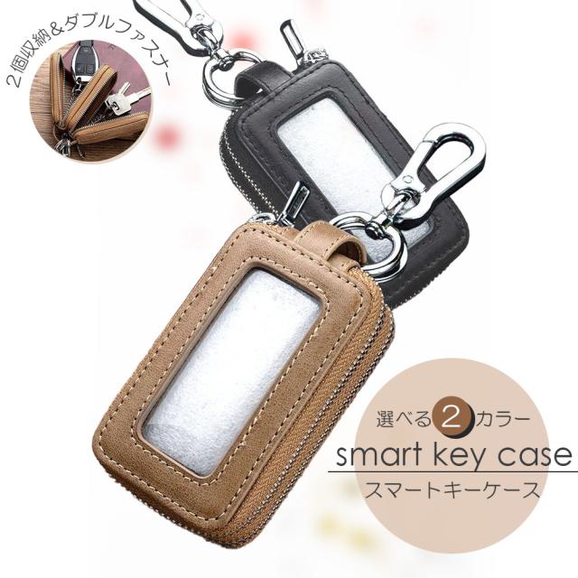 スマートキーケース スマートキーカバー 2個収納 スマートキー対応 キーケース カラビナ付き 窓付き 2色 レディース 車 メンズ キーホルダー 車キーカバー クリア窓 ダブルジッパー プレゼント ペア ダブル