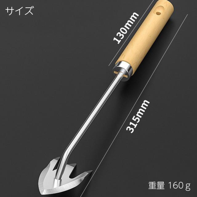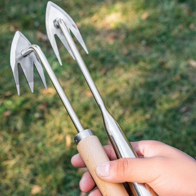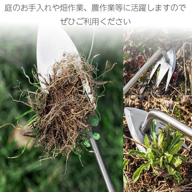 ステンレス鋼材料を採用していますので、強く錆にくく安定してご使用できます。三つのくし形の刃は、雑草の根をしっかり捕らえることができます。先の刃は厚くて鋭利で、切れ味もよく、雑草と根を完全に取り除き、高効率に作業できます。また、精密鍛造により耐久性に優れていて、変形しにくく、壊れにくいです。