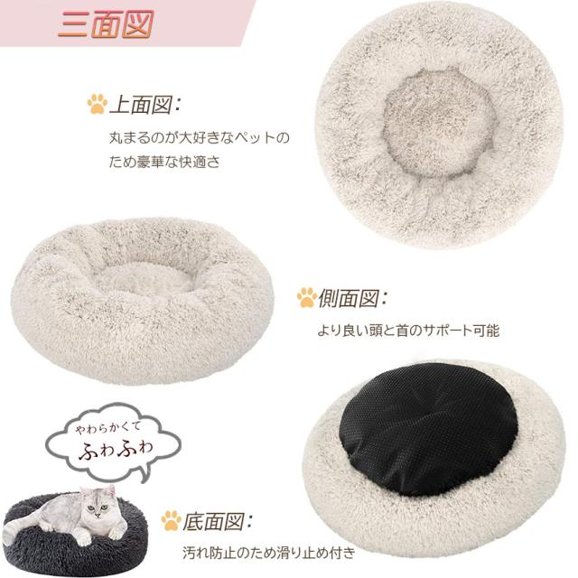【ふわふわ生地】表面は4CMの長毛素材となり、中には高反発のPP綿をたっぷり充填し、軽くて滑らかな心地よさです。冬や夏に冷房でペットの体温を維持することができます。柔らかい丸いドーナツ型のデザインで、犬猫用ベッドはどの方向ても柔らかい。