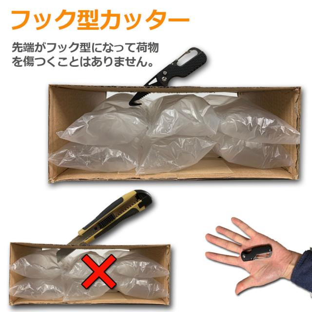 【フック型カッター】先端がフック型になっており、段ボール開封の時中の荷物をきずつけない設計になっております。