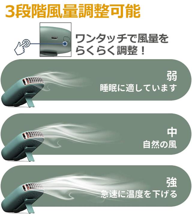 【3段階風量調整 首掛け扇風機】風量が三段階調節できる携帯扇風機です。ポタンを押すと簡単に風力を弱風>自然風>強風の順で切り替えることができます。弱モードは優しい風を感じさせ、中モードと強モードは夏の焦りを除去し、心を落ち着かせます。手軽な首掛け扇風機ながらしっかりと爽やかな感覚が味わえ、蒸し暑い季節は自分に合った涼しさで常に快適に過ごすことができます。