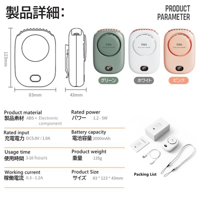 【上部から送風 多功能の携帯扇風機】首にかけるだけで両手がふさがることなく風を送ることが出来る首かけタイプの携帯扇風機が新登場。携帯扇風機、首掛け、腰ベルトファン、卓上に置くの4つの使い方。暑さが厳しい日に、首元を冷やすことで一層涼しさを体感でき、特にマスクをして外を歩いても蒸れ感がだいぶ軽減され、熱中症防止にもなってくれます。【3段階風量調整 首掛け扇風機】風量が三段階調節できる携帯扇風機です。ポタンを押すと簡単に風力を弱風>自然風>強風の順で切り替えることができます。弱モードは優しい風を感じさせ、中モードと強モードは夏の焦りを除去し、心を落ち着かせます。手軽な首掛け扇風機ながらしっかりと爽やかな感覚が味わえ、蒸し暑い季節は自分に合った涼しさで常に快適に過ごすことができます。