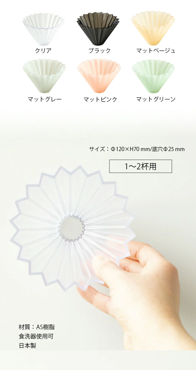 軽量、耐衝撃性に優れ、気軽に持ち運びが出来るAS樹脂製のORIGAMIドリッパーです。冷めにくく、抽出時の湯温を維持しやすいのも利点です。1〜2杯用。 |