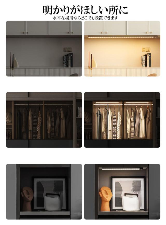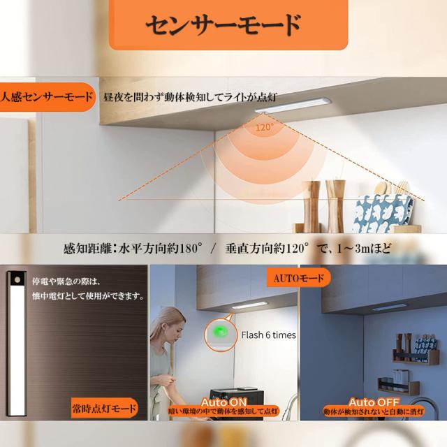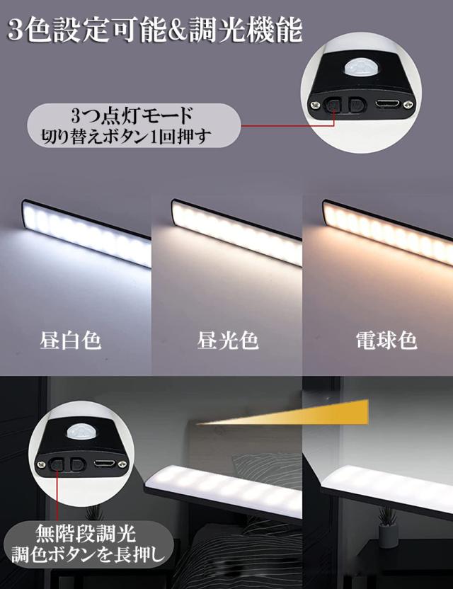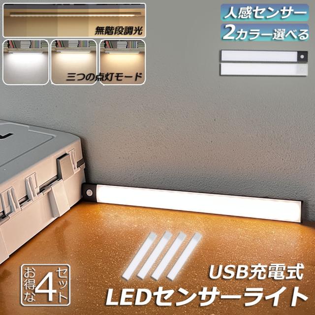 LEDセンサーライト 人感センサーライト 4個セット キッチンライト フットライト LEDバーライト 色温度/明るさ調整可能 40cm 3段階調色 電球色 昼白色 昼光色 超薄型設計 非接触 USB充電式 ケーブル付き 無段階調光 手元灯 流し元灯 台所