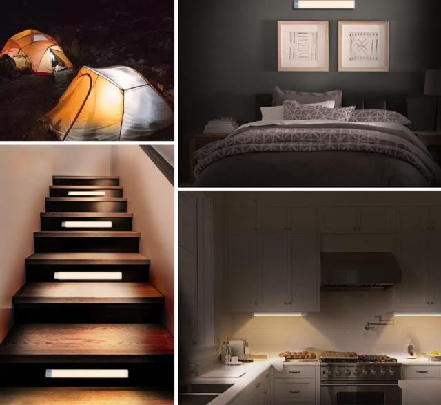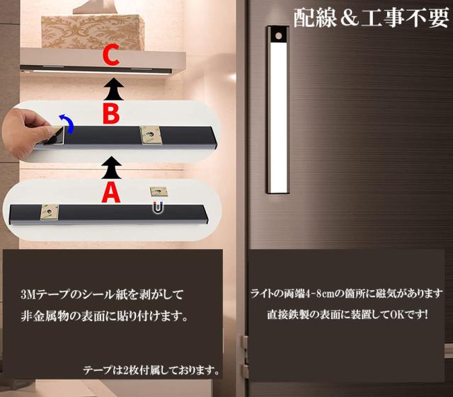 【取り付けが簡単&マグネット式】方法1、センサーライトの両端には強力マグネットが付き、金属表面(冷蔵庫のドアなど)に直接吸着できます。方法2、パッケージ内の2枚の金属テープを取り付けたい場所に貼り付けてから、灯体を金属テープに直接吸着できます。マグネットとライト本体は分離可能。お手軽い階段・寝室・廊下・玄関・キッチン・ガレージ・倉庫・戸棚などご装置したい場所に貼り付けできます。