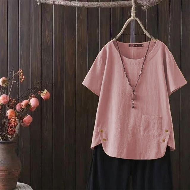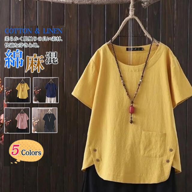 Tシャツ レディース 半袖 ポケット付き 綿麻 カラー配色 無地 薄手 ゆったり シンプル カジュアル エレガント きれいめ 普段着 お出かけ 夏服