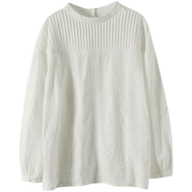ブラウス レディース シャツ 長袖 シャツブラウス プリーツ 綿 レース スタンドカラー 無地 春秋 フォーマル ゆったり 通勤 きれいめ フェミニン