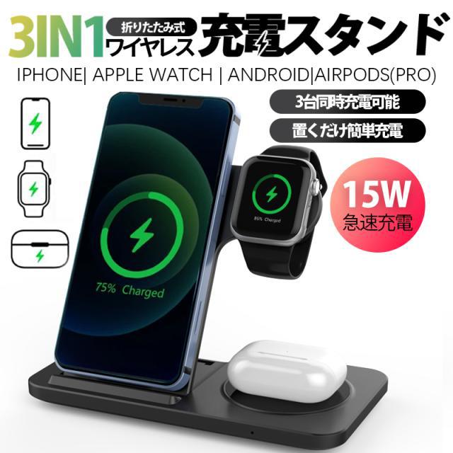 【即日発送】 ワイヤレス充電器 3in1 15w iPhone 充電スタンド 折り畳み ワイヤレスチャージャー Airpods Qi急速充電 apple watch
