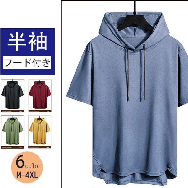 半袖パーカー パーカー メンズ 半袖 カジュアル 薄手 カラー配色 無地 Tシャツ ゆったり 夏アイテム 夏 夏用 おしゃれ ロック 涼しい サマー