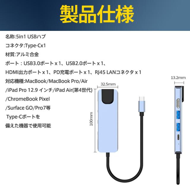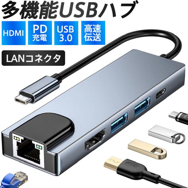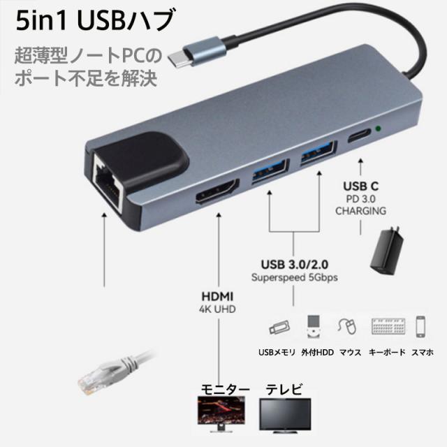 USBハブ 5in1 ドッキングステーション 5ポート PD充電 有線LAN 4K HDMI ギガポート LANポート イーサネット 変換アダプター