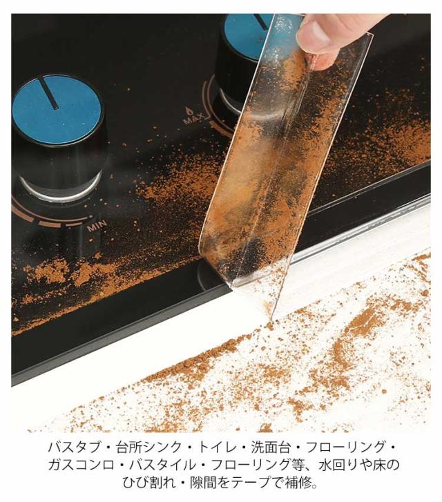 | 防水&防カビテープ PVC素材で柔らかく割れにくいテープ。 お掃除にくい隙間への水・汚れ・ゴミ等の侵入を防ぎます。 水をこぼしても染み込みにくく、拭き取るだけですぐキレイ。 簡単にお掃除でき、カビや匂いの防止にも。 透明なので目立ちにくいです。 テープを押し付けて貼り、軽く温めるだけでしっかり貼り付け。 バスタブ・台所シンク・トイレ・洗面台・フローリング・ガスコンロ・バスタイル・フローリング等、水回りや床のひび割れ・隙間をテープで補修。 ガラス・タイル・なめらかな木材・ABS樹脂・金属等にご使用いただけます。 隙間埋め・キズ隠しが誰でも簡単に行えます。 | |