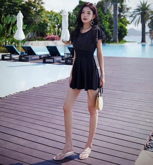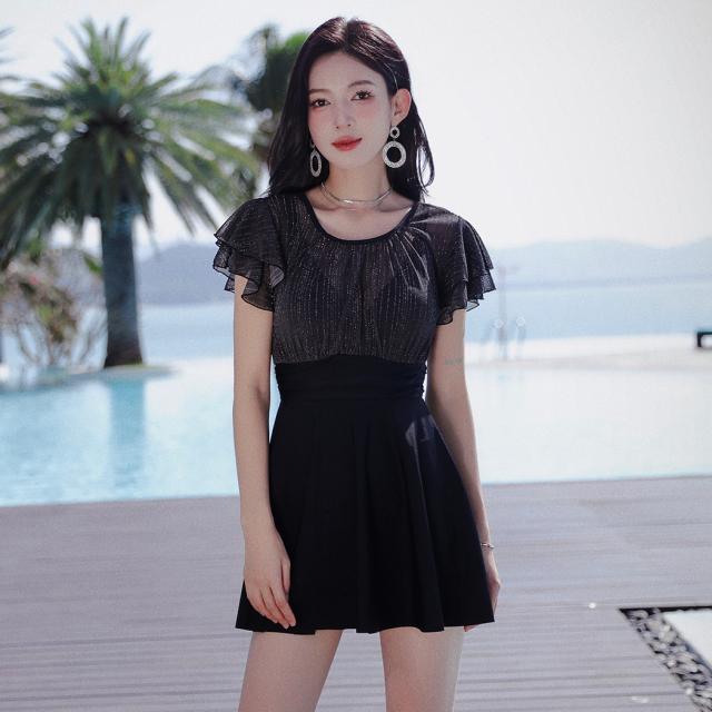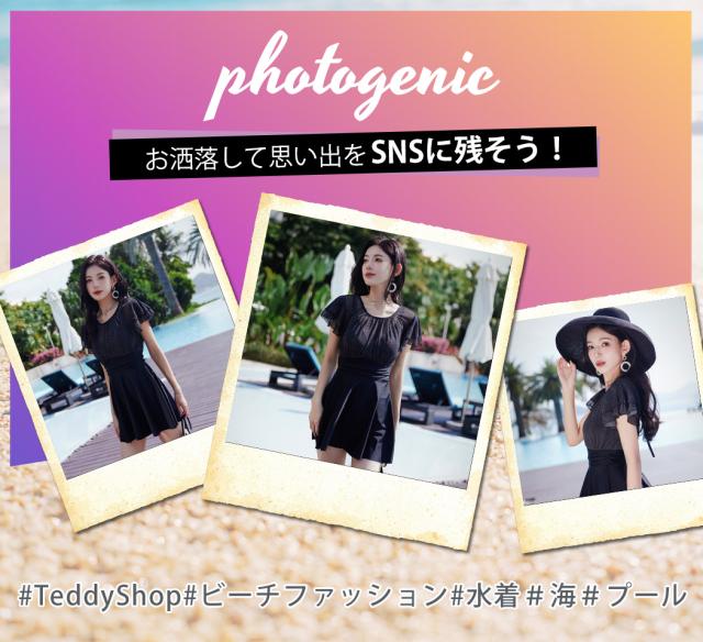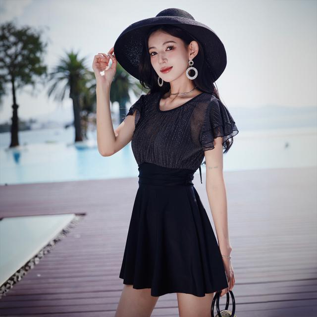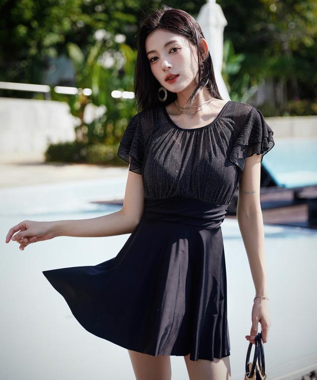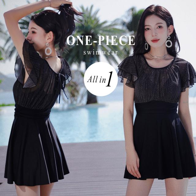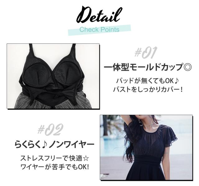 春新作 水着 レディース ワンピース オールインワン 体型カバー 半袖 おしゃれ かわいい エンジェルスリーブ 大人 黒 バックリボン バックシャン 切りっぱなし スカート ウエスト 切り替え パッド一体型 ノンワイヤー