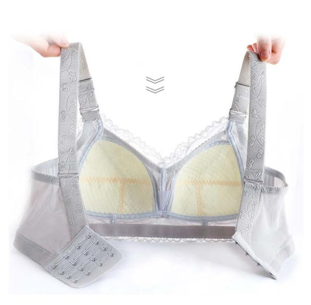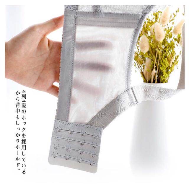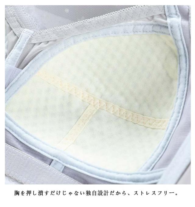 | 【バストの膨らみ、立体感を抑えた独自のカップ】より胸を小さく見せるようカップの膨らみは極限まで抑えつつ、自然で美しいバストラインを実現。胸を押し潰すだけじゃない独自設計だから、ストレスフリー。 【太めのストラップでバストをキープ】肩への負担が少ない太めのストラップを採用したので、胸のお肉が流れるのをせき止め、大きなバストをしっかり支えます。4列4段のホックを採用しているから背中もしっかりホールド。 | |