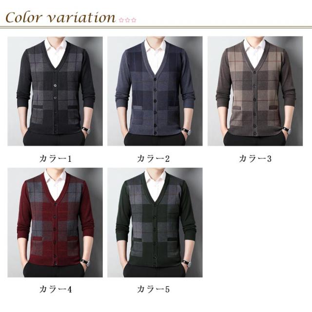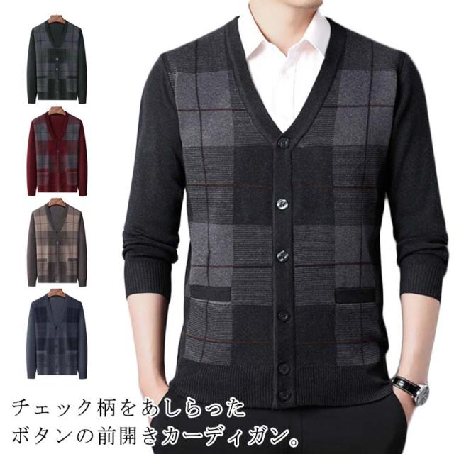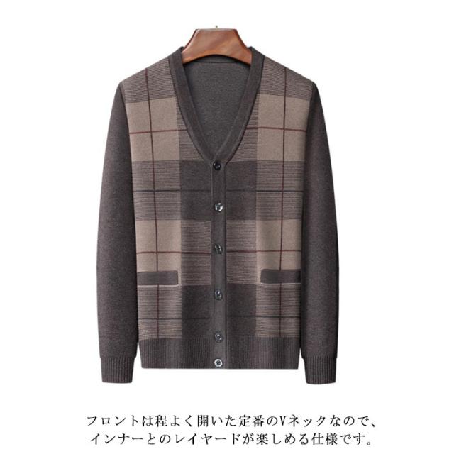 暖かい ニットカーディガン Vネック メンズ カーディガン チェック柄 セーター カーディガン ライトアウター 敬老の日 ギフト 40代 50代