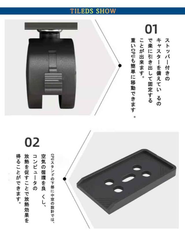 | 【CPUスタンド】【キャスター付】 CPUスタンドの下部に中空の設計では、空気の循環を良 くし、 コンピュータの放熱を促すことで放熱効果を得ることができます。 ストッパー付きのキャスターを備えてい るので楽に引き出して固定することが出来ます。重いCPUも簡単に移動できます 。 PCなどを床に直接置くと、掃除の際に移動が大変。当製品はキャスター付きなので移動が簡単です。床から距離あるのでホコリの侵入を防ぐことができます。 パソコン以外にも!移動させることの多い加湿器や除湿機の家電、重みのある植木鉢や観葉植物置きにも使える便利アイテム! | |