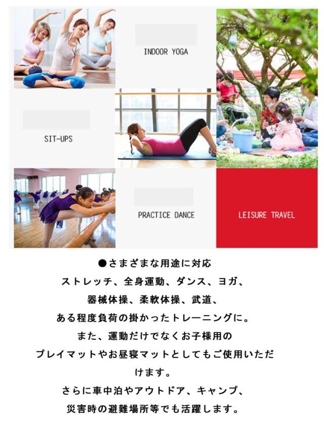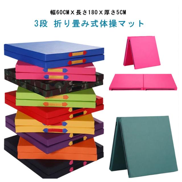 | 幅60cmx長さ180x厚さ5cm 3段 折り畳み式体操マット ●発泡ポリエチレン製マットで衝撃吸収 マットの中身はクッション性に優れた発泡ポリエチレンを採用!厚さは約5cmで運動時の衝撃をしっかろ吸収し身体への負担を軽減してくれます。 ●PVCレザー生地のカバーでお手入れ簡単 PVCレザーの防水生地だから汗をかいても水をこぼしても乾いたタオルでサッと拭くだけで簡単きれい! ●極厚5cmだから防音性抜群! 厚さは約5cmあるため衝撃吸収はもちろん、運動時の騒音を軽減! ●三つ折りでコンパクト 三つ折りでたたむことができ、大きさの割りにコンパクトに収納できます。 取っ手が付いており、持ち運びが簡単に出来ます。 ●さまざまな用途に対応 ストレッチ、全身運動、ダンス、ヨガ、器械体操、柔軟体操、武道、ある程度負荷の掛かったトレーニングに。 また、運動だけでなくお子様用のプレイマットやお昼寝マットとしてもご使用いただけます。 さらに車中泊やアウトドア、キャンプ、災害時の避難場所等でも活躍します。 | |