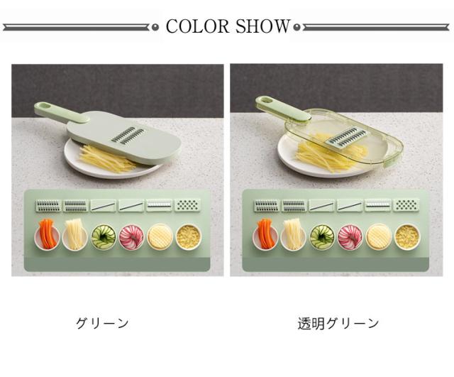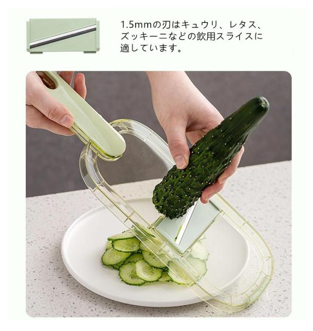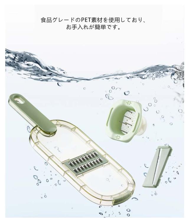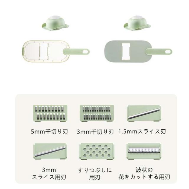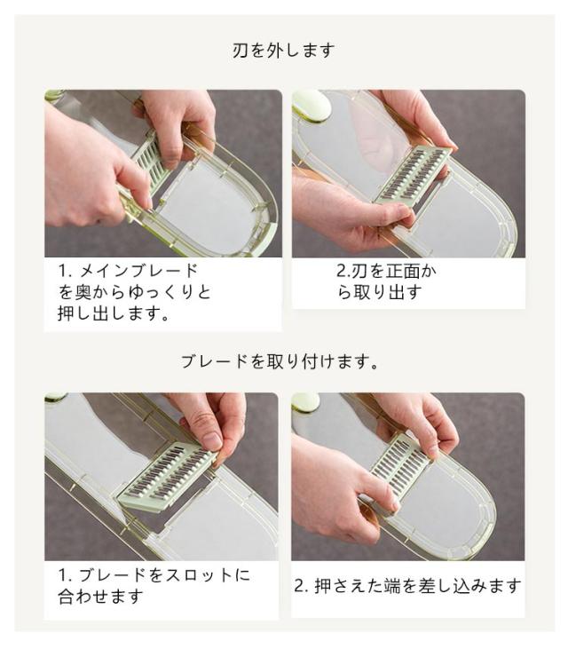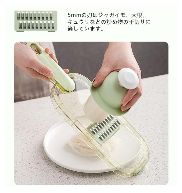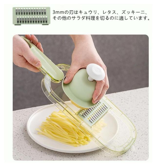 | 千切りやスライスができる多機能キッチンツール ハンドガード付きで安心・快適、小さな食材を切る時も安心です。 食品グレードのPET素材を使用しており、お手入れが簡単です。 大きな穴があり、吊り下げや保管に便利で、スペースを節約できます。 ハンドプロテクターの使用方法: 1. 滑り止めピンに釘を打つ 2. 高さ調節可能 3. 安全に使用できます 刃を外します 1. メインブレードを奥からゆっくりと押し出します。 2.刃を正面から取り出す ブレードを取り付けます。 1. ブレードをスロットに合わせます 2. 押さえた端を差し込みます 5mmの刃はジャガイモ、大根、キュウリなどの炒め物の千切りに適しています。 3mmの刃はキュウリ、レタス、ズッキーニ、その他のサラダ料理を切るのに適しています。 1.5mmの刃はキュウリ、レタス、ズッキーニなどの飲用スライスに適しています。 刃厚1.3mmはジャガイモ、レモン、ニンジンなどの炒め物のスライスに適しています。 すりつぶしに用刃は生姜の粉砕に適しています。 ニンニク、ジャガイモなどをすりつぶしてピューレ状にする 波状の花をカットする用刃はジャガイモやニンジンなどを切るのに適しています。 | |