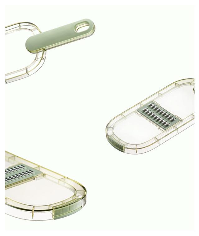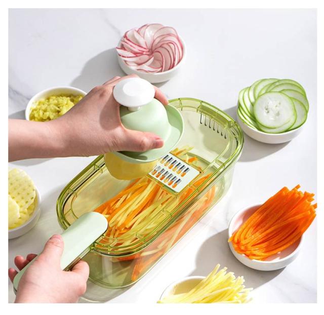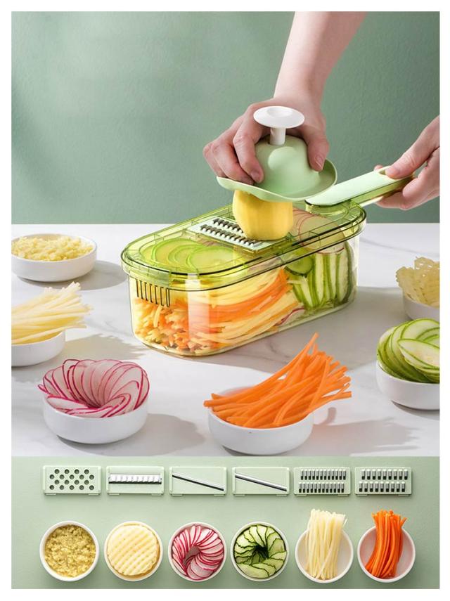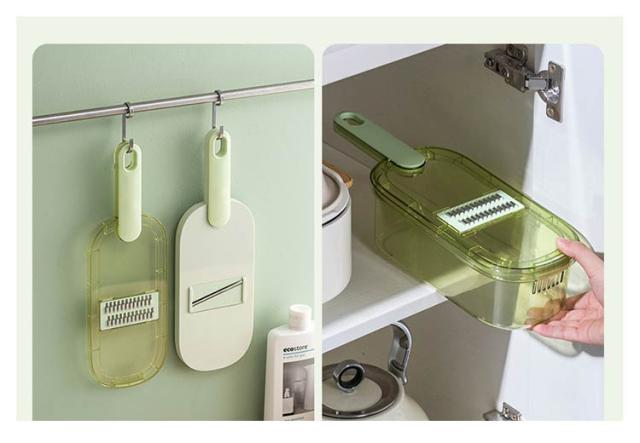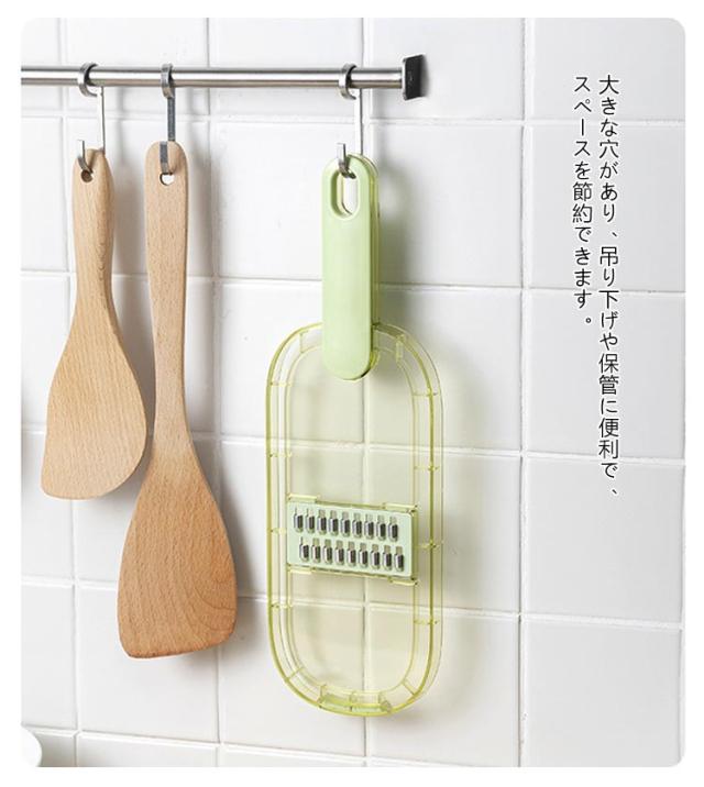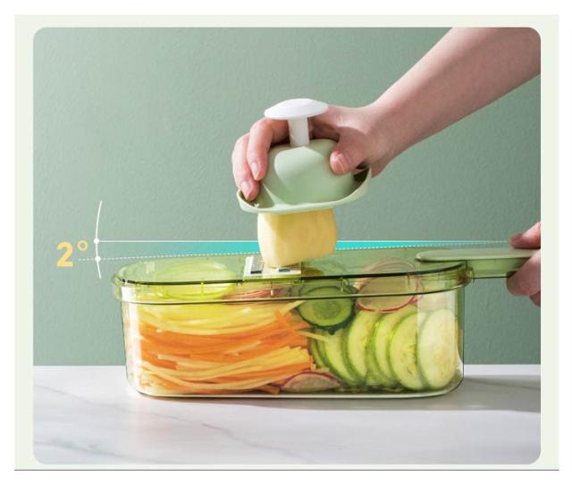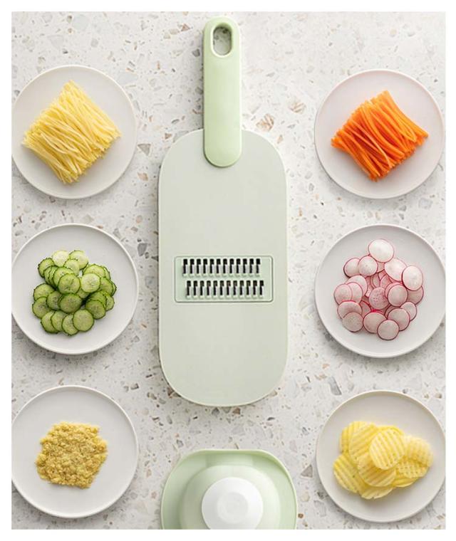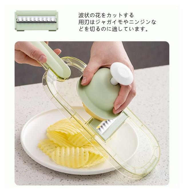 | 千切りやスライスができる多機能キッチンツール ハンドガード付きで安心・快適、小さな食材を切る時も安心です。 食品グレードのPET素材を使用しており、お手入れが簡単です。 大きな穴があり、吊り下げや保管に便利で、スペースを節約できます。 ハンドプロテクターの使用方法: 1. 滑り止めピンに釘を打つ 2. 高さ調節可能 3. 安全に使用できます 刃を外します 1. メインブレードを奥からゆっくりと押し出します。 2.刃を正面から取り出す ブレードを取り付けます。 1. ブレードをスロットに合わせます 2. 押さえた端を差し込みます 5mmの刃はジャガイモ、大根、キュウリなどの炒め物の千切りに適しています。 3mmの刃はキュウリ、レタス、ズッキーニ、その他のサラダ料理を切るのに適しています。 1.5mmの刃はキュウリ、レタス、ズッキーニなどの飲用スライスに適しています。 刃厚1.3mmはジャガイモ、レモン、ニンジンなどの炒め物のスライスに適しています。 すりつぶしに用刃は生姜の粉砕に適しています。 ニンニク、ジャガイモなどをすりつぶしてピューレ状にする 波状の花をカットする用刃はジャガイモやニンジンなどを切るのに適しています。 | |