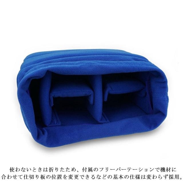 | ミラーレス&一眼レフカメラを収納できるインナーカメラバッグです。 いつもの鞄をカメラバッグとして使用することができるようになります。 カメラ本体だけでなく、レンズもストロボ一緒にたっぷり収納することができます。 使わないときは折りたため、付属のフリーパーテーションで機材に合わせて仕切り板の位置を変更できるなどの基本の仕様は変わらず採用。 インナーカメラバッグの全面には緩衝材を内蔵しているので、衝撃や重さを緩和できるし、ホコリの侵入も防ぎます。 お手持ちの鞄にそのまま入れるだけでどこにも持ち運びラクラク。カメラをインナーカメラバッグといつものカバンの二重でしっかり保護でき、落下防止対応、安心! 機器のサイズに合わせて様々な収納の組み合わせを試してみてください。 | |