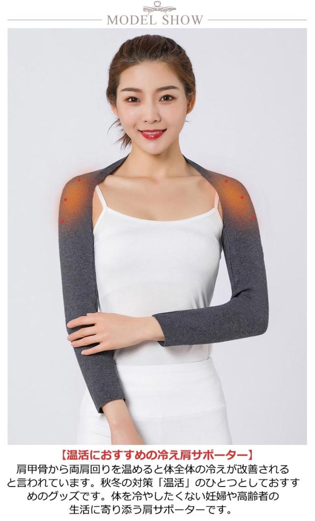 | 秋冬用厚手 就寝時の冷房対策や真冬の冷え対策に! 【温活におすすめの冷え肩サポーター】肩甲骨から両肩回りを温めると体全体の冷えが改善されると言われています。秋冬の対策「温活」のひとつとしておすすめのグッズです。体を冷やしたくない妊婦や高齢者の生活に寄り添う肩サポーターです。 【冷房対策に大活躍】 肩を温めることで、寒気が和らぎ、睡眠の質を上げる効果があります。一枚羽織っていると布団が落ちたときなど寒さに気が付きにくく、朝までぐっすり快眠が得られます。 【やわらか素材】軽量のため違和感なく装着していただけます。ごわつかないためお洋服のシルエットを崩すこともありません。肌着の上から着て頂いて、その上からトップスやニットを着てもOK!伸縮素材なので、気になる二の腕対策にもピッタリ。 【心地よいフィット感】長時間の着用でも疲れない適度なフィット感と通気性があります。アームカバーのように羽織るだけで簡単に装着可能で、締め付け感がありません。洗濯などお手入れもしやすく、長くご愛用いただけます。 | |
