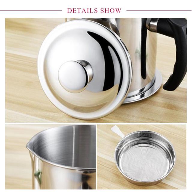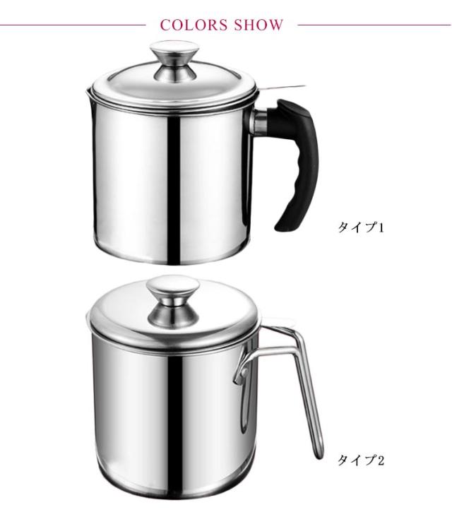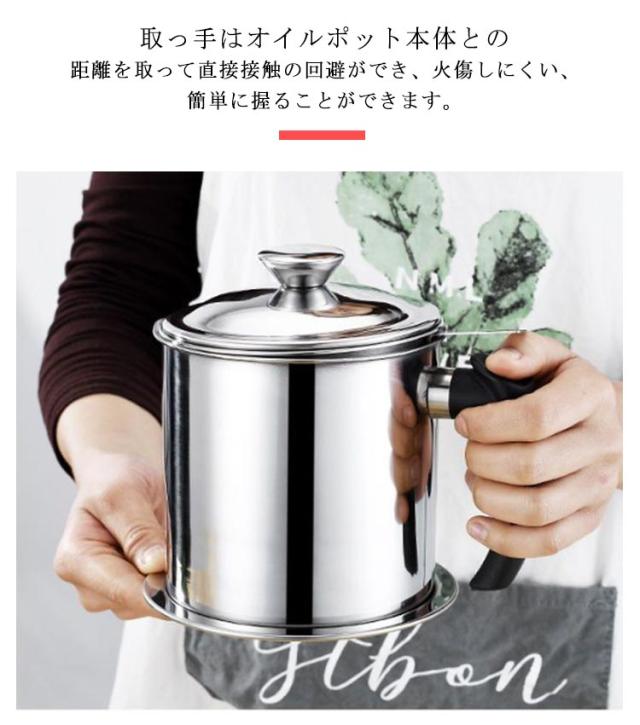 | ステンレス製フィルター付きオイルポット。 オイルポット本体と油こし網がステンレス製で酸化防止、腐食防止、防錆、滴下防止、衛生的に油を保存してくれ、劣化にも強いのが魅力です。 丈夫で耐食性に優れたステンレス製で耐久性も強くて、分体式の設計でお手入れが簡単です。 シンプルなデザインでキッチンに並べても邪魔にならない コンパクトなサイズが魅力のオイルポット。 適正容量1.2 Lとたっぷり入れます。揚げ焼きや揚げ物シーンに便利です。 取っ手はオイルポット本体との距離を取って直接接触の回避ができ、火傷しにくい、簡単に握ることができます。 | |
