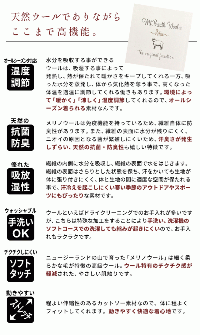 特徴 人気のマウントブレスウールシリーズの5分袖Tシャツ。サラッとした肌触り、見た感じも、触った感じもウールとは思えない。でも、極細のウール糸を使って編み立てた生地だから、風合いはサラサラ。汗をかいても直ぐに吸い取るからオールシーズン着られます。