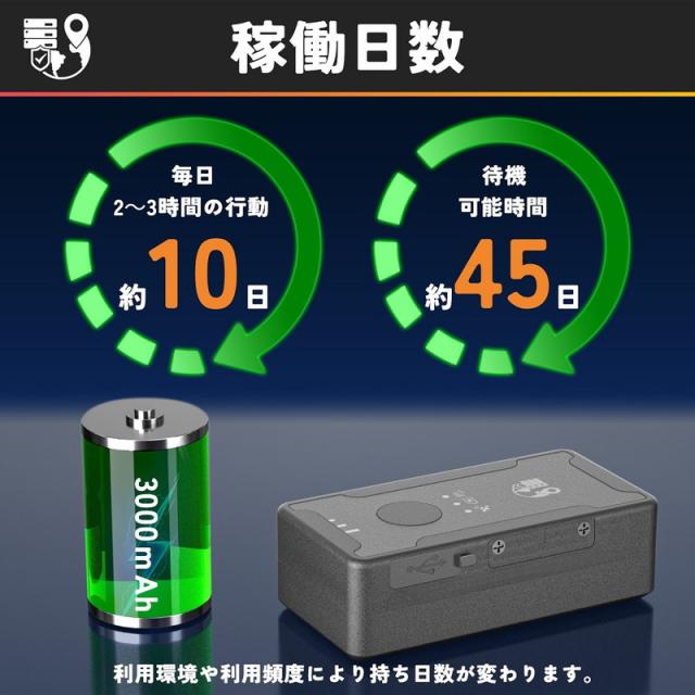 【長時間稼働】3000mAh電池内蔵。1分間隔発信で、1日2〜3時間の稼働で最長15日持ちます。(利用環境と利用頻度によります)