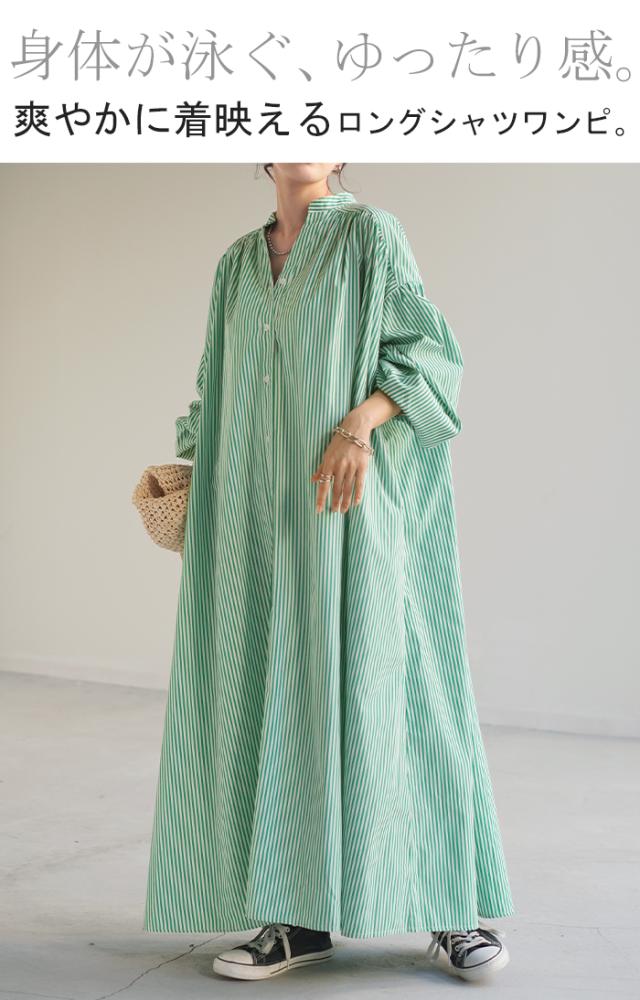 ワンピ シャツ シワになりにくい ワンピース シャツワンピ シャツワンピース ワンピース バックシャン ストライプ レディース ロング フレア ロングワンピース ギャザー Aライン 長袖 前開き 切り替え 大きいサイズ グリーン 青 黒 春 冬 HUG.U 秋新作