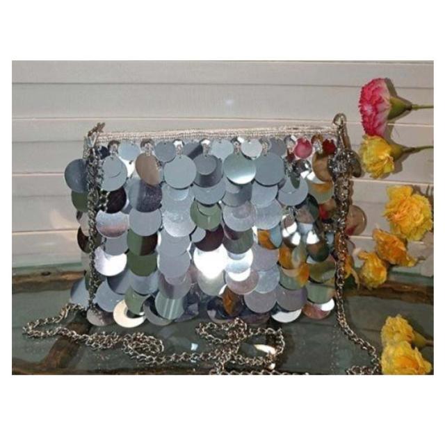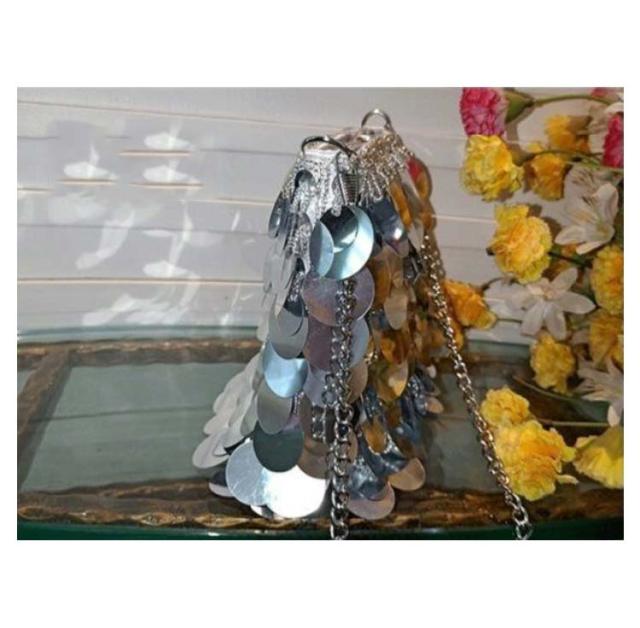 | とてもゴージャスなシルバーの ショルダーバック 大きめのスパンコールがキラキラと輝き 存在感を放ちます パーティやナイトクラブに♪ | |