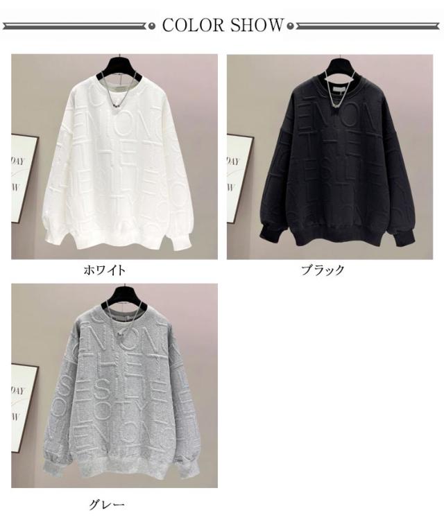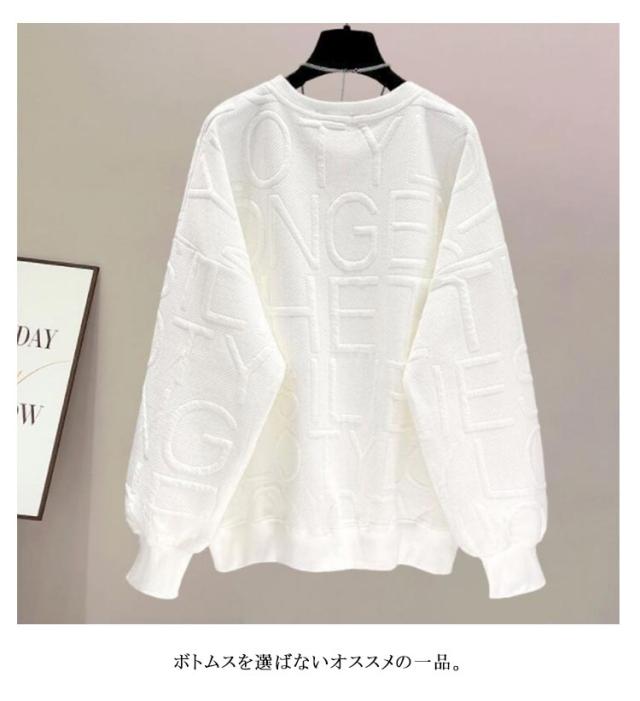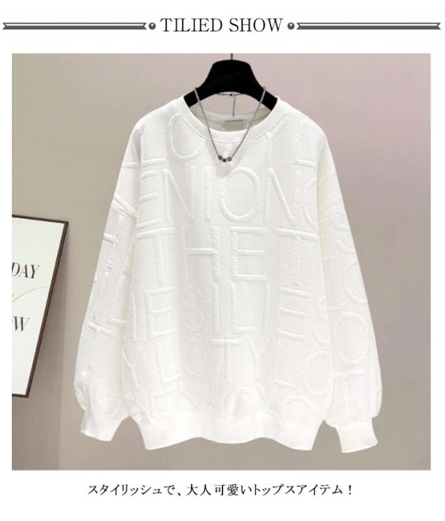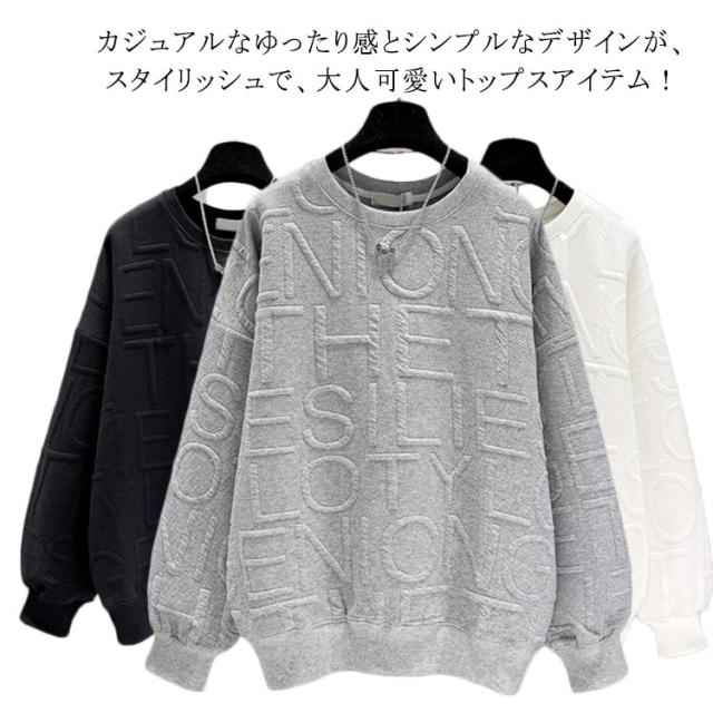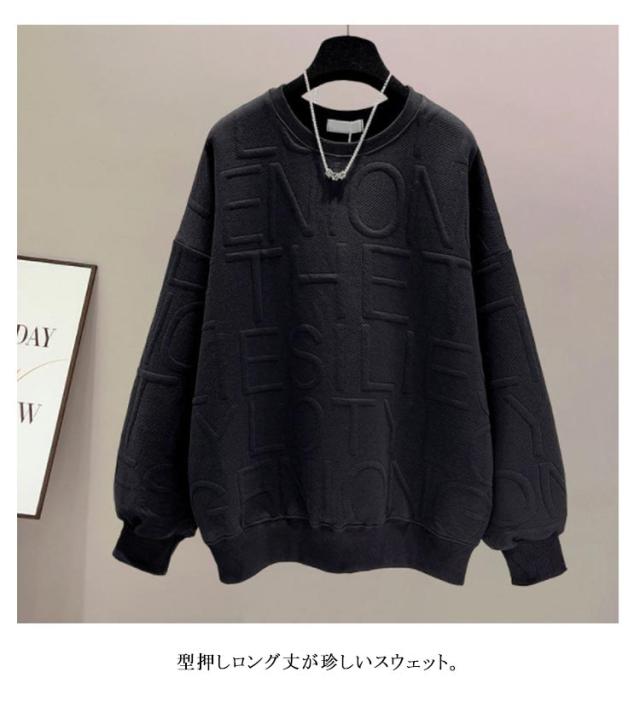 トレーナー 長袖 クルーネック スウェット 型押し エンボス加工 トップス レディース ロング丈 カジュアル プルオーバー ロゴ おしゃれ 着回し スポーティ 春 秋 韓国 韓国ファッション 20代 30代 40代 50代