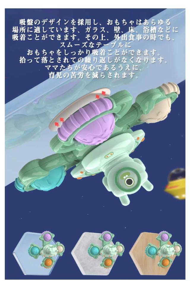 | 新登場!宇宙テーマ! 【優しい色といろいろな型】 カラフルな双葉、三枚葉、四枚葉の3種類、滑らかな形状、バリや角がなく触り心地が良い、こまを回転しているうちに、赤ちゃんの手の世話をします。更に、さまざまな色や数字の認知を深めるだけでなく、方向感覚を鍛えることも可能です。 【不安解消】 吸盤のデザインを採用し、おもちゃはあらゆる場所に適しています、ガラス、壁、床、浴槽などに吸着ことができます。その上、外出食事の時でも、スムーズなテーブルにおもちゃをしっかり吸着ことができます。拾って落とされての繰り返しがなくなります。ママたちが安心であるうえに、育児の苦労を減らされます。 【プッシュポップ】 大人にもストレス解消のおもちゃとして使用できます。柔らかなシリコン製ボタンの泡を押して、わずかに弾けるような音がします、そして、それら押し戻し、何回も繰り返してから仕事のストレスをすぐ解消にも役に立ちます、ボタンはバブルの感覚です。 【感覚刺激】 楽しみ中の握り、吸着、回転、押す、その他の動きは、赤ちゃんの目と指先の協調を改善し、手の動きを行使するのに役に立ちます。滑らかに長く回り続けるので、赤ちゃんが自分で振って音を出したりして興味を持つことができます。 【素晴らしいおもちゃ】 回転すると色がより魅力的になります。さまざまなカラフルなパターンと1〜2分の回転時間で、お子様は100%幸せになります。 2歳から7歳の男の子と女の子のための素晴らしいおもちゃ。 | |