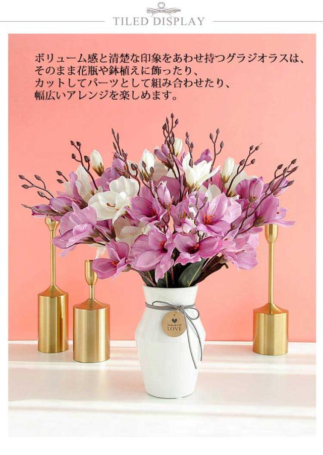 | ・インテリアやアレンジメントに♪ ・ボリューム感と清楚な印象をあわせ持つグラジオラスは、そのまま花瓶や鉢植えに飾ったり、カットしてパーツとして組み合わせたり、幅広いアレンジを楽しめます。 ・ご自宅用はもちろん、開店祝い・新築祝い、ご結婚祝いなど様々な贈り物にご使用いただけます。 ・造花は枯れることもなく虫の発生もないのでお手入れも簡単。 ・水やりの必要もなく扱いやすいのが造花の1番の特徴です。 ・造花は長期間きれいな状態を保ち想い出に残せます。 ・ご自宅用として、贈り物やプレゼントにいかがでしょうか? | |
