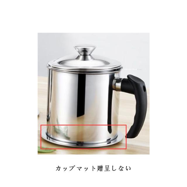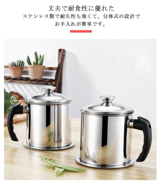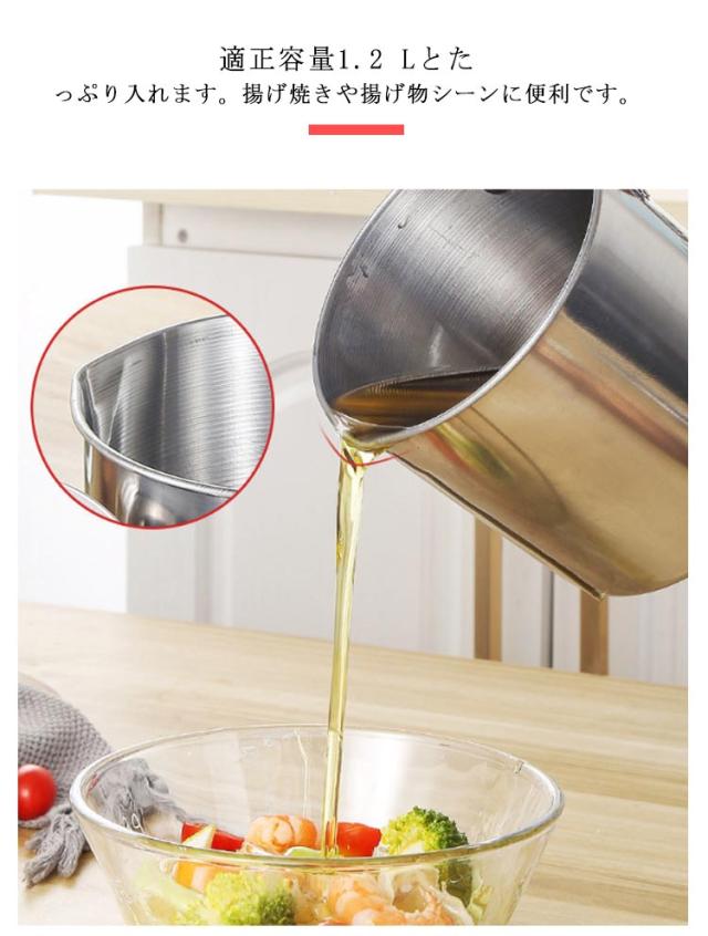| ステンレス製フィルター付きオイルポット。 オイルポット本体と油こし網がステンレス製で酸化防止、腐食防止、防錆、滴下防止、衛生的に油を保存してくれ、劣化にも強いのが魅力です。 丈夫で耐食性に優れたステンレス製で耐久性も強くて、分体式の設計でお手入れが簡単です。 シンプルなデザインでキッチンに並べても邪魔にならない コンパクトなサイズが魅力のオイルポット。 適正容量1.2 Lとたっぷり入れます。揚げ焼きや揚げ物シーンに便利です。 取っ手はオイルポット本体との距離を取って直接接触の回避ができ、火傷しにくい、簡単に握ることができます。 | |