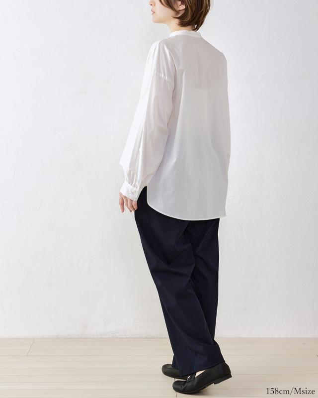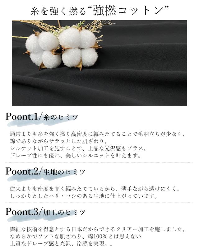 | 商品詳細/その他 | サラッとした感触と豊かなドレープ感・上品な光沢で綿100%とは思えない上質感を生み出す着心地の良い強撚コットンを使用したワイドパンツ。 |